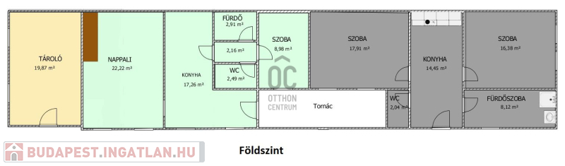 A ház 410nm-es 3 gépkocsi parkolóhellyel ellátott telken helyezik el. A két lakrész teljesen elkülönül egymástól, a kisebb házrészben (mely közelebb helyezkedik el az utca fronthoz) nappali, hálószoba, konyha, fürdőszoba, külön toalett került kialakításra. A nagyobb házban a földszinten, konyha, nappali, fürdőszoba, toalett, 1 hálószoba, az emeleti szinten 3 hálószoba, fürdőszoba került kialakításra.