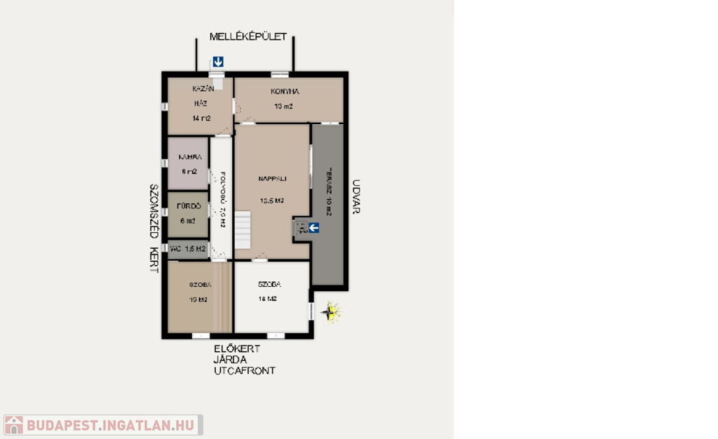 1 nappali, 2 szoba, 1 konyha, 1 fürdő, 1 külön WC, 1 kazánház, terasz