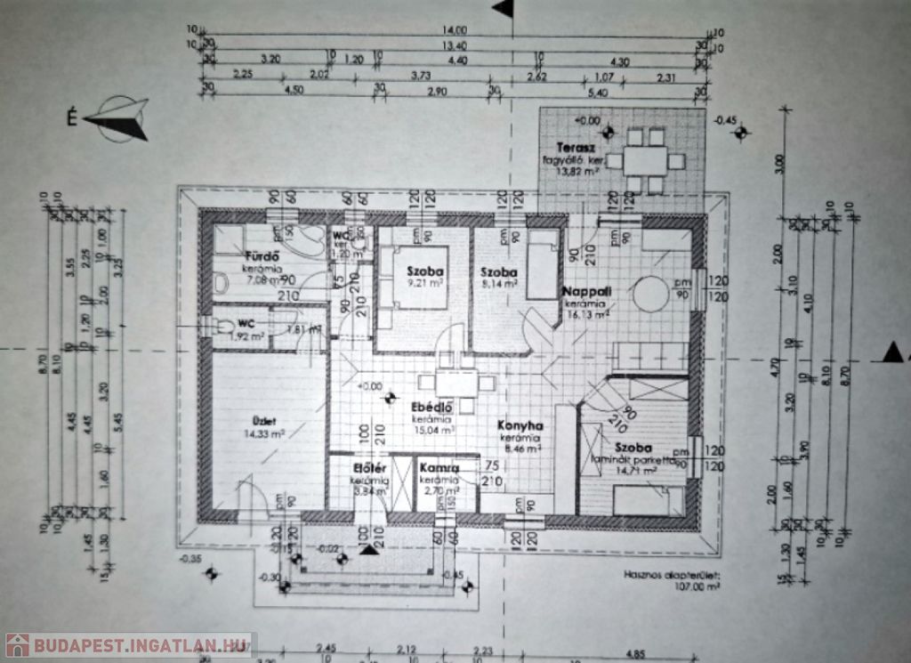 Az Otthon helyiségei:előtér 3,84 m2, ebédlő 15,04 m2, konyha 8,46 m2, nappali 16,13 m2, szoba 14,71 m2, szoba 8,14 m2, szoba 9,21 m2, fürdőszoba 7,08 m2, wc 1,20 m2, jelenleg üzlet/szoba 14,33 m2,
