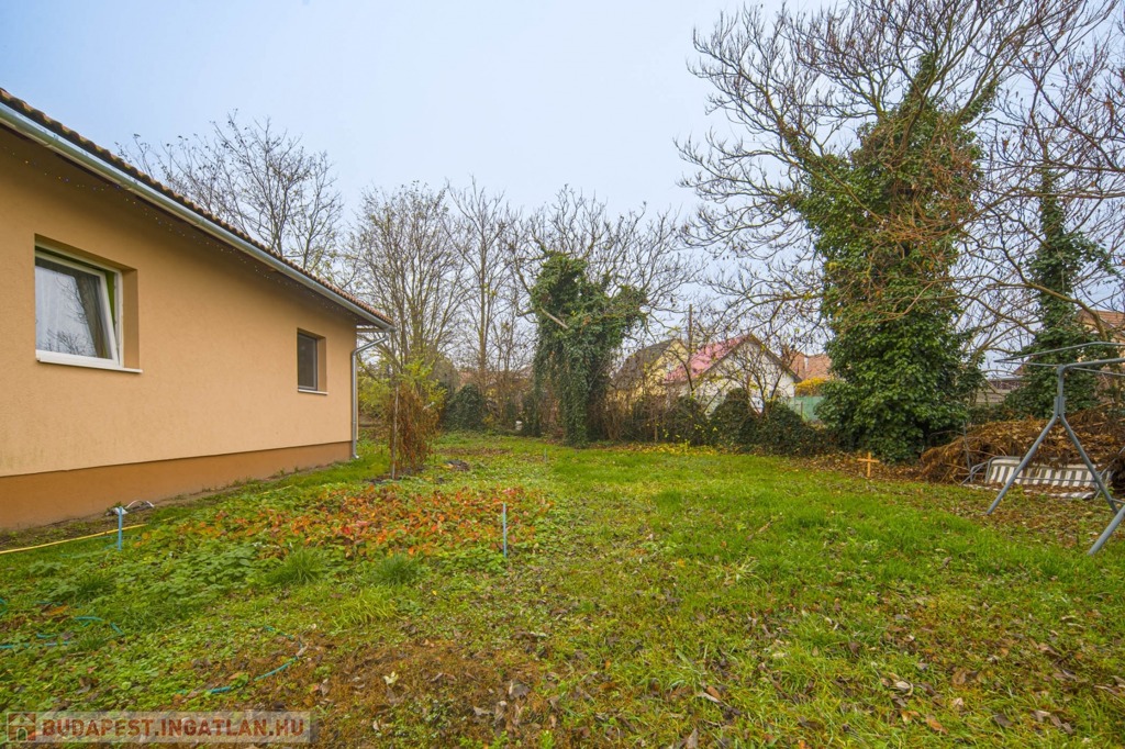 A 736 m²-es telken elhelyezkedő ingatlanban 3 hálószoba, amerikai konyhás nappali, fürdőszoba, vendégmosdó és egy spejz kapott helyet.