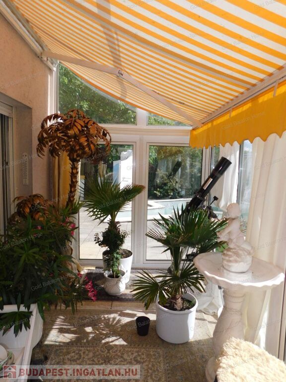 - földszint: előszoba, közlekedő, konyha+étkező, kamra, nappali, téli kert, kávézó bárpulttal, WC kézmosóval, panorámás grillező és napozó terasz medencével, amely: 5*8 m, 1,5 m mély