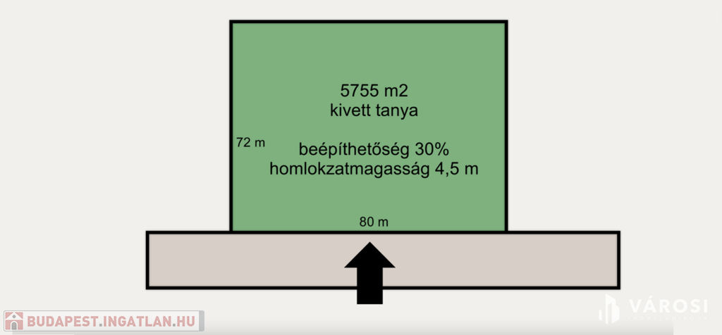 A fenyőerdővel körülvett telek mérete 5755 m2, amely maximális beépíthetősége 30%, lakóépület építése esetén 4,5 m a maximális homlokzat magasság. Az ingatlanra a villany bevezetésre került.
