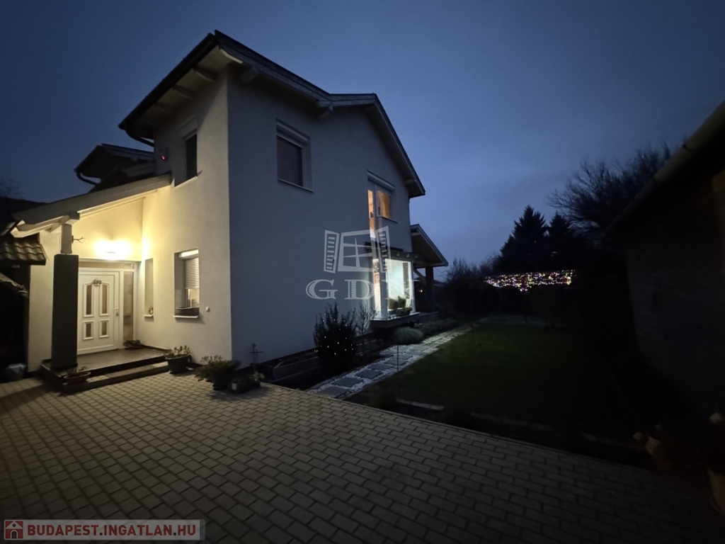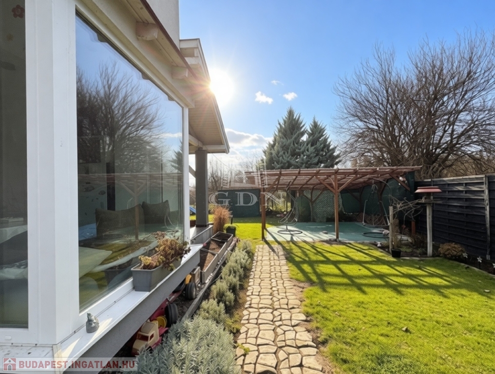 A telek 584m2, egy része térkövezett, hátsó része füvesített. A házhoz kapcsolódik egy fedett beálló és egy garázs is.