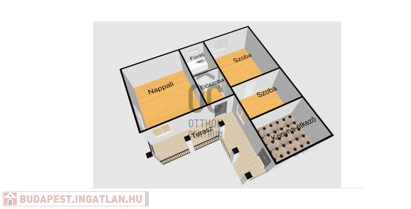 Az utcáról az udvaron át megközelíthető házba, a fedett teraszról léphetünk, az előtérbe, melyből a nappali egy szoba és a fürdőszoba érhető el. A szobába belépve pedig a harmadik szobát érjük el.
