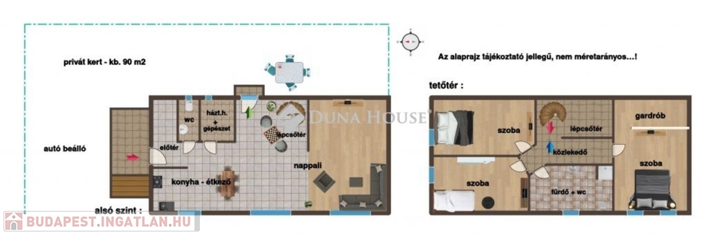 Az ingatlan teljes körű műszaki és esztétikai felújítása befejeződött - jöhetnek a bútorok, bőröndök - azonnal költözhető, birtokba vehető ! A 114 m2-es két szintes ház alsó részén, előtér, vendég wc, háztartási és gépészeti helyiség valamint egy bomba méretű amerikai konyhás nappali van kialakítva, beépített gépesített konyhabútorral. Egy kényelmes lépcső vezet az emeletre ahol egy gardróbbal kombinált szülői háló, további két hálószoba és egy tágas fürdőszoba wc-vel kapott helyet. A házhoz kb. 100 m2 körbekerített udvar is tartozik, térkövezett gépkocsi beállóval ...