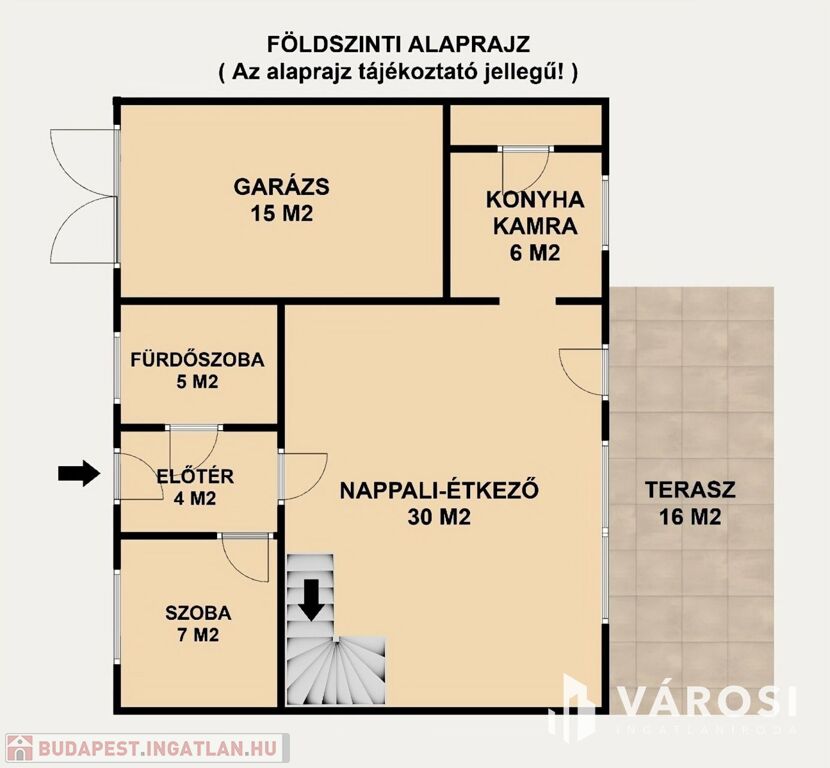 A földszinten egy tágas amerikai konyhás nappali található, melyből közvetlen kijárat nyílik a 16 m²-es teraszra és a parkosított, kb. 80 m²-es saját kertrészbe. Ezen a szinten található még egy vendégszoba, zuhanyzós fürdőszoba WC-vel, kamra és előszoba is.