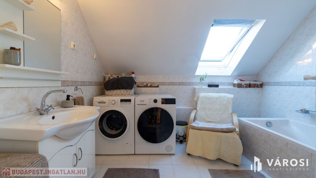 A három éve megújított, modern konyha gáz főzőlappal, elektromos sütővel és beépített mosogatógéppel felszerelt. A fürdőszobában a mosógép és a szárítógép is kényelmesen elfér. A melegvíz-ellátást és a fűtést gázkazán biztosítja.