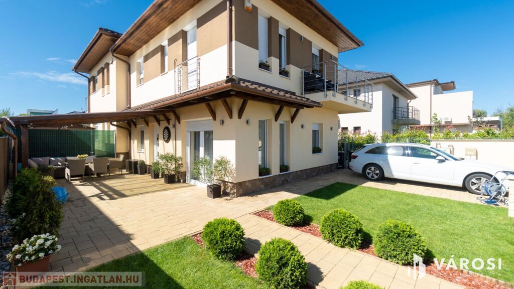 Eladó Siófok Sóstó városrészén egy 2020-ban épült ikerház utcafronti része. Az épület kiváló állapotban van. Precízen átgondolt, rendkívül praktikusan megtervezett bruttó 115 m²-es házról van szó, melyhez 30 m² térkövezett terasz (melyből 20 m² fedett), egy nagy 7m²-es erkély, valamint udvaron belüli térkövezett gépjárműbeálló tartozik. Az ingatlan külön helyrajzi számon van saját telekhányaddal, mely 174 m². Összesen 86 m² nettó lakótérről beszélhetünk. A földszinten található az amerikai konyhás nappali, egy szoba, egy fürdőszoba és egy külön WC. Az emelet 2 szobával, egy nagy fürdőszobával, gépészeti helyiséggel, közlekedővel, valamint egy tágas 7 m²-es erkéllyel rendelkezik.