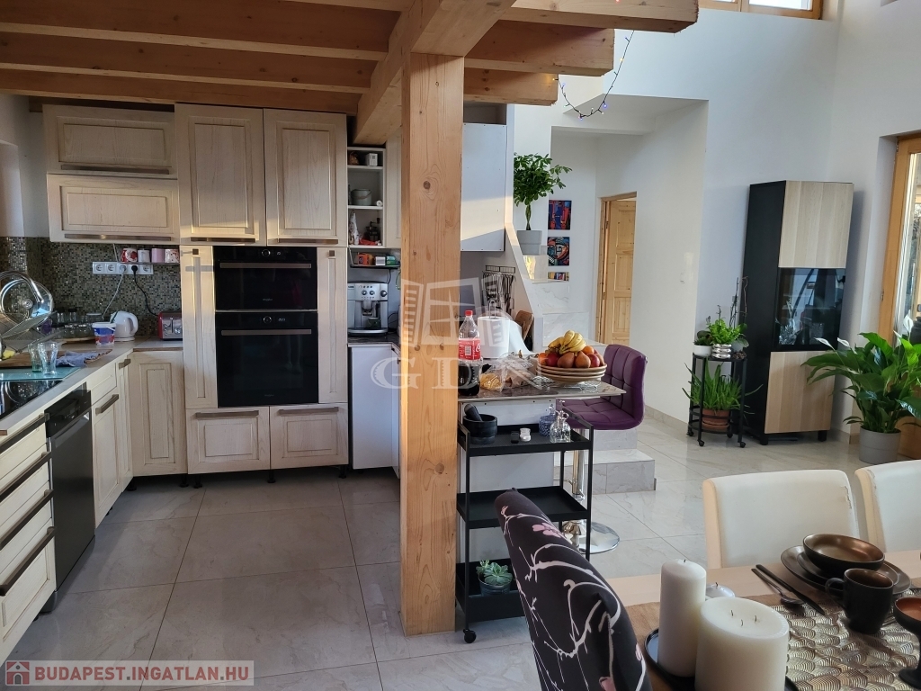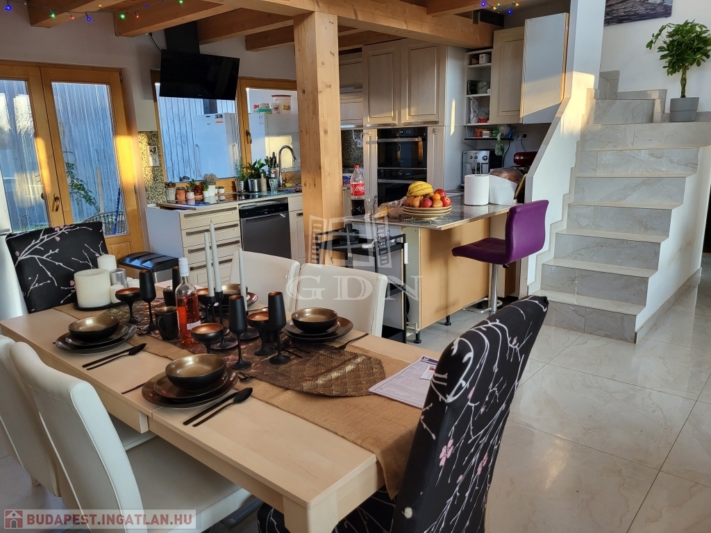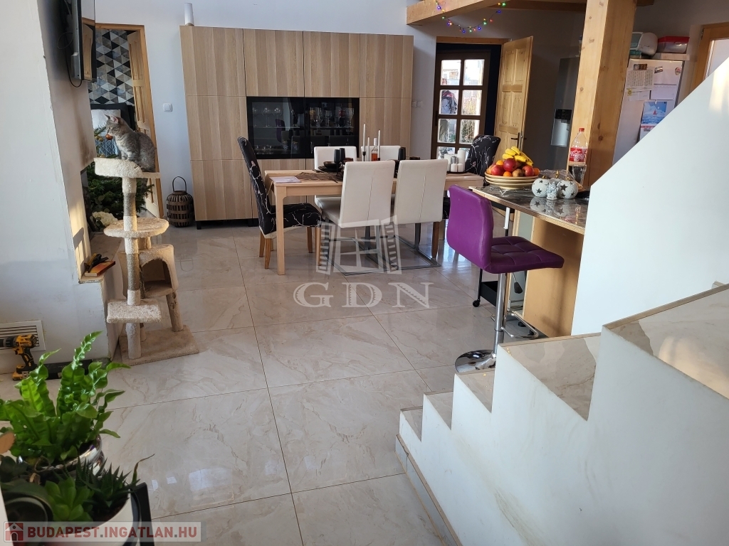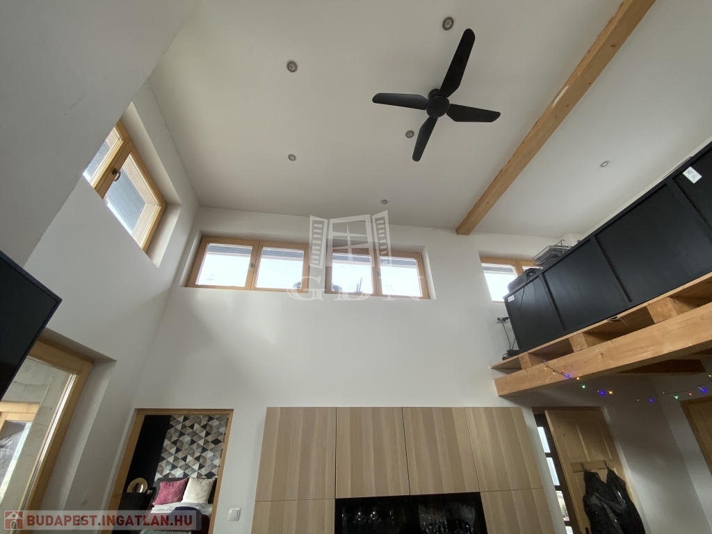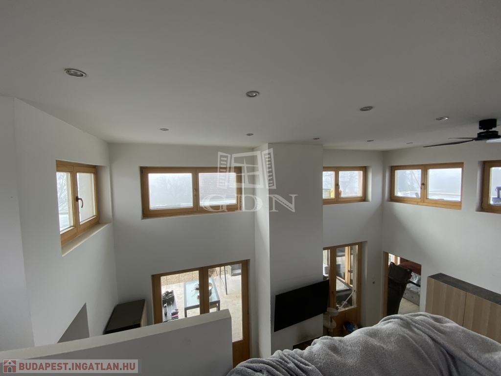 A ház központi része a tágas nappali+amerikai konyha+étkező helyiség, amely összesen 35 m2 és hozzá tartozik még egy 12 m2-es galéria. A nappaliban egy hangulatos kandalló került kialakításra, melynek hátoldalán kerti kemence is kiépíthető. A nappaliban jellemzően a világos színek dominálnak és sok ablak került kialakításra benne, így egy luxus hatású, világos helyiség amely eléri a 4,5 méteres belmagasságot is.