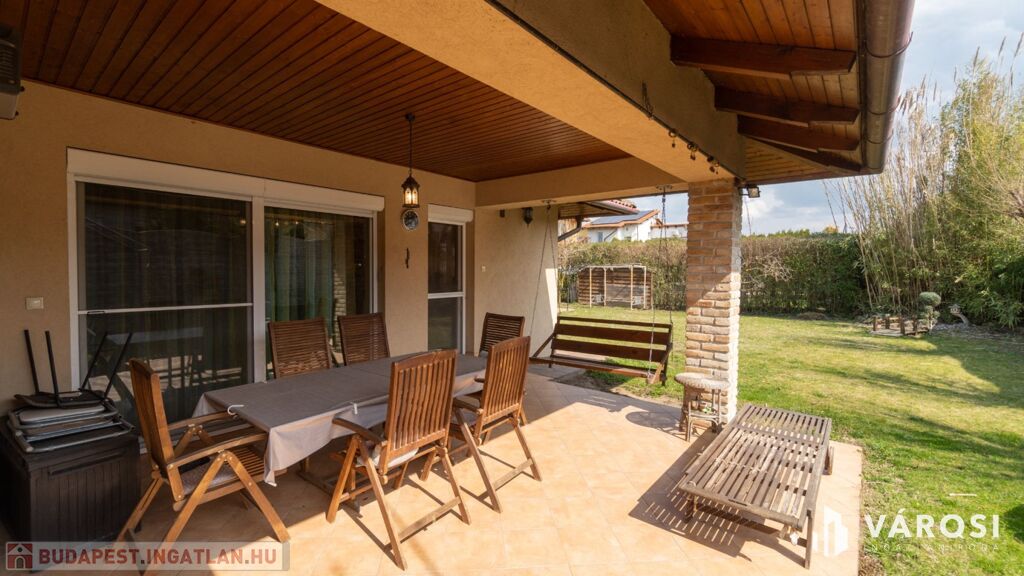 A 40 nm-es, kényelmes duplagarázs mellett a kovácsoltvas jellegű, távvezérelt kapun keresztül több autó számára is biztosított a bejutás. A kert igazi oázis: a dísznövények és gyümölcsfák között egy kerti tároló is segít a rendszerezésben. Ezen felül egy fúrt kút is található.