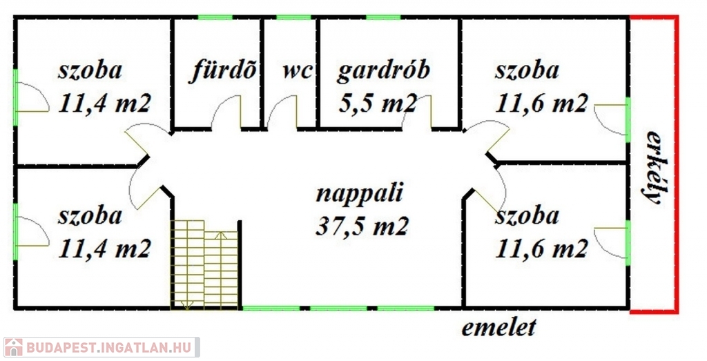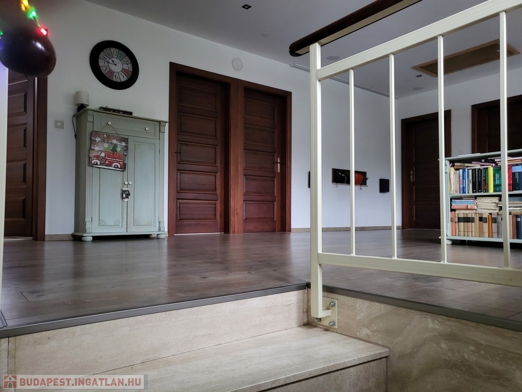 Az emeleten egy tágas, napfényes közös tér házi mozi rendszerrel, 4 erkélyes hálószoba, kényelmes mellékhelyiség, illetve fürdőszoba lett kialakítva.