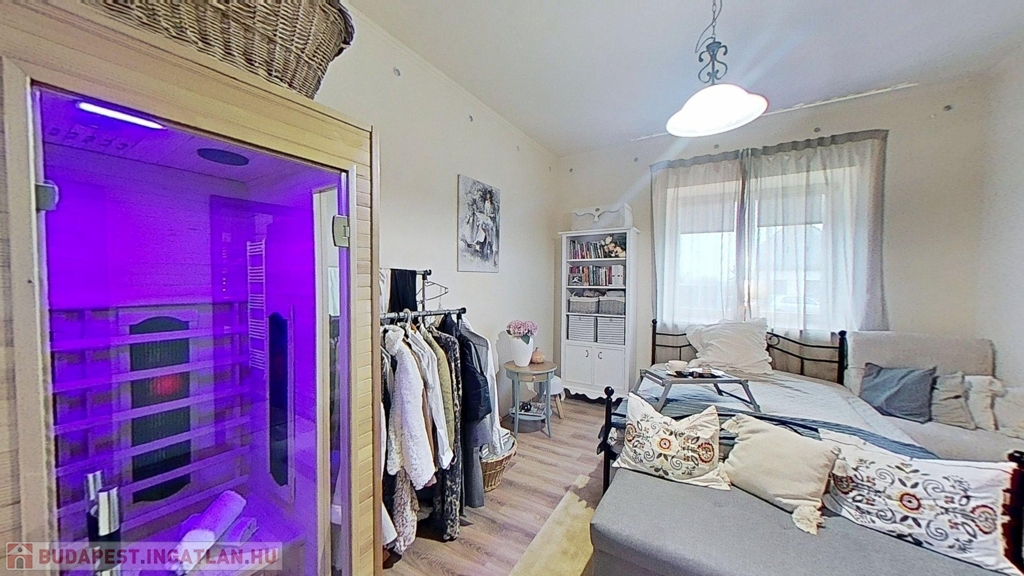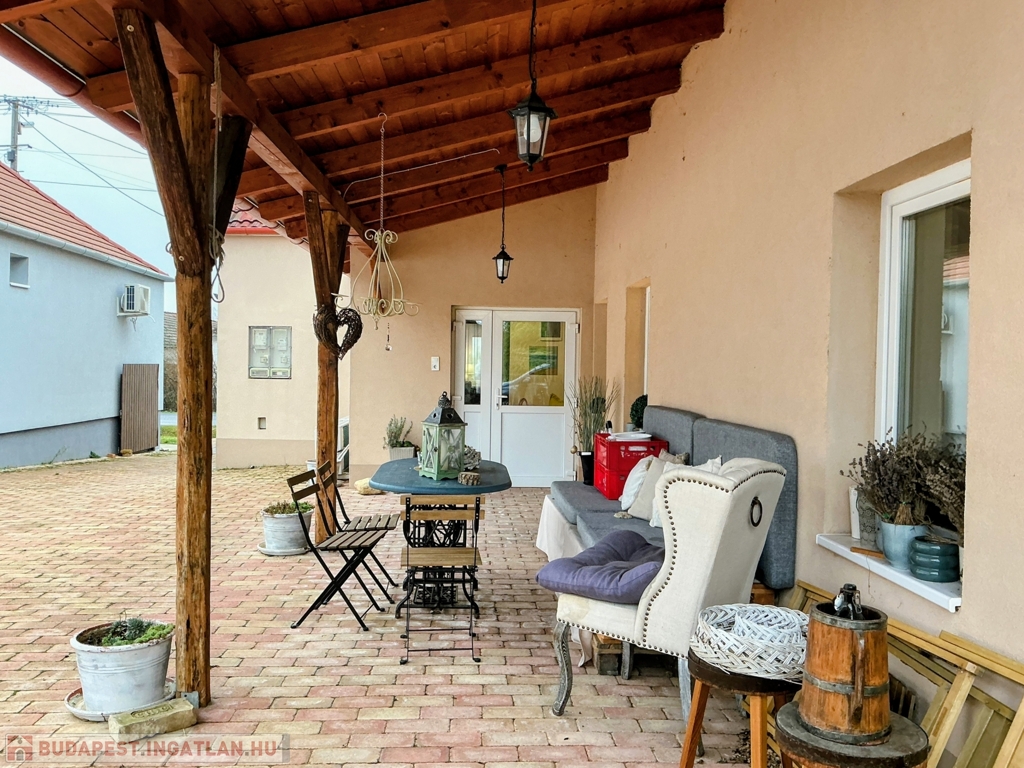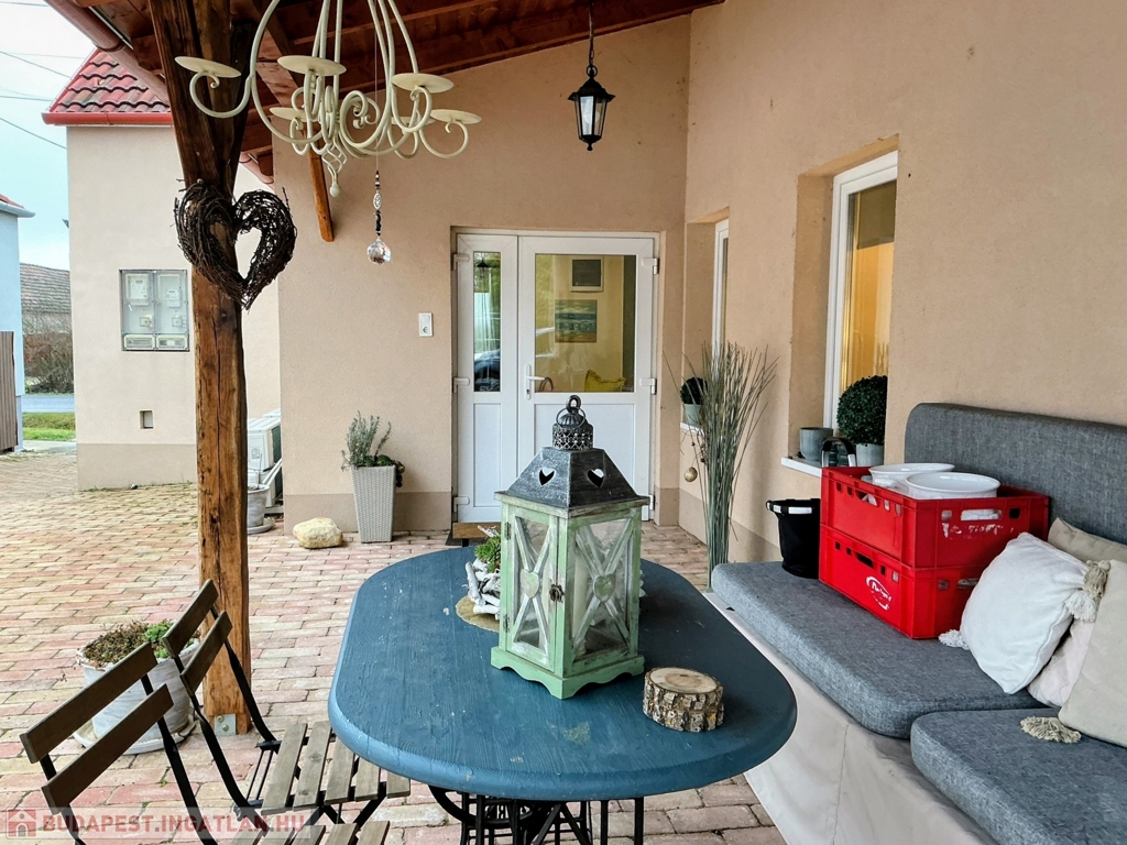 A ház földszintes, két bejárata van, melyek előtt egy 30 m2-es fedett terasz került kialakításra. Belső hasznos területe 85 m2, egészen egyedi, pazar belső bútorzattal, melyek a vételár részét képezik. Funkcióváltásra is alkalmas, hiszen 3 különálló szoba került kialakításra, és mindegyik rendelkezik saját fürdőszobával, ezen túl egy gardrób és egy előszoba alkotják a belső tereit. Ez utóbbi a későbbiekben épült az eredetileg L-alakú alaprajzú házhoz, a 2019-es felújítás alkalmával. Tehát az épület alkalmas jelenleg 2 vendégapartman kialakítására is, amennyiben valaki befektetési szándékkal vásárolna.