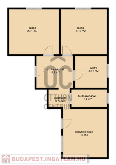 - 3 szoba, nappali, konyha, fürdőszoba-WC helyiségekből áll.
