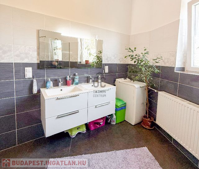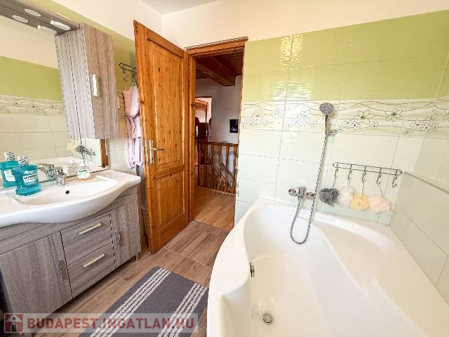 Az emeleti fürdőszoba aszimmetrikus káddal és dupla mosdóval ellátott.