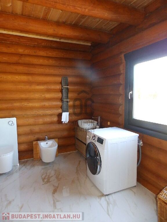 A faépítésű ház meleg hangulata, modern burkolatokkal és szaniterekkel egészül ki.