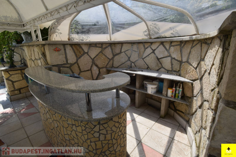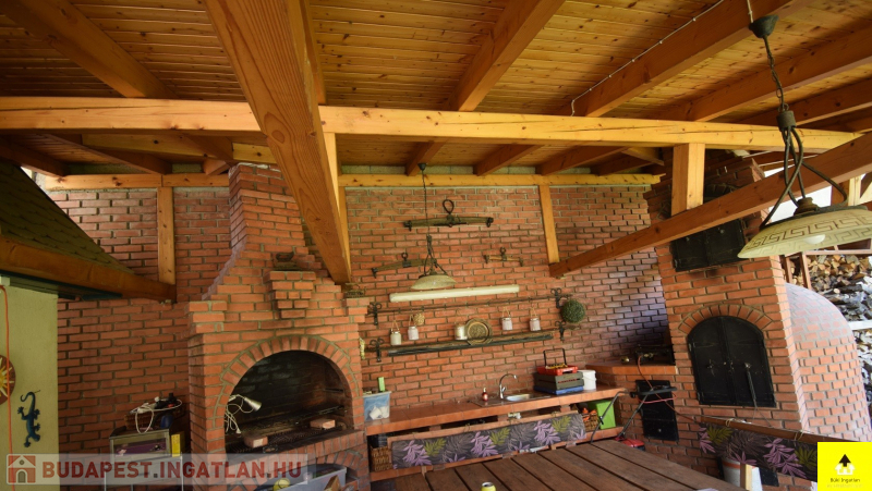 különálló, kis épület nyári konyhával, téglából épített grillsütővel és fedett kiülővel