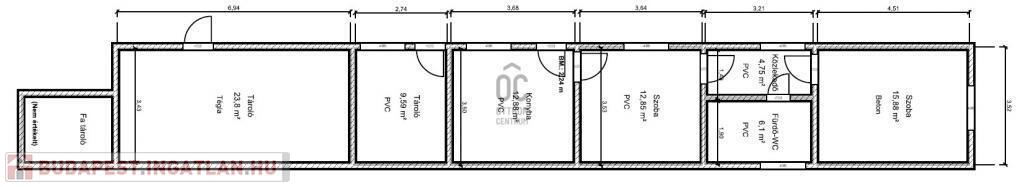 - két hálószoba, konyha + étkező, közlekedő, fürdő + WC, tároló helyiségekből áll