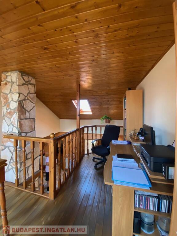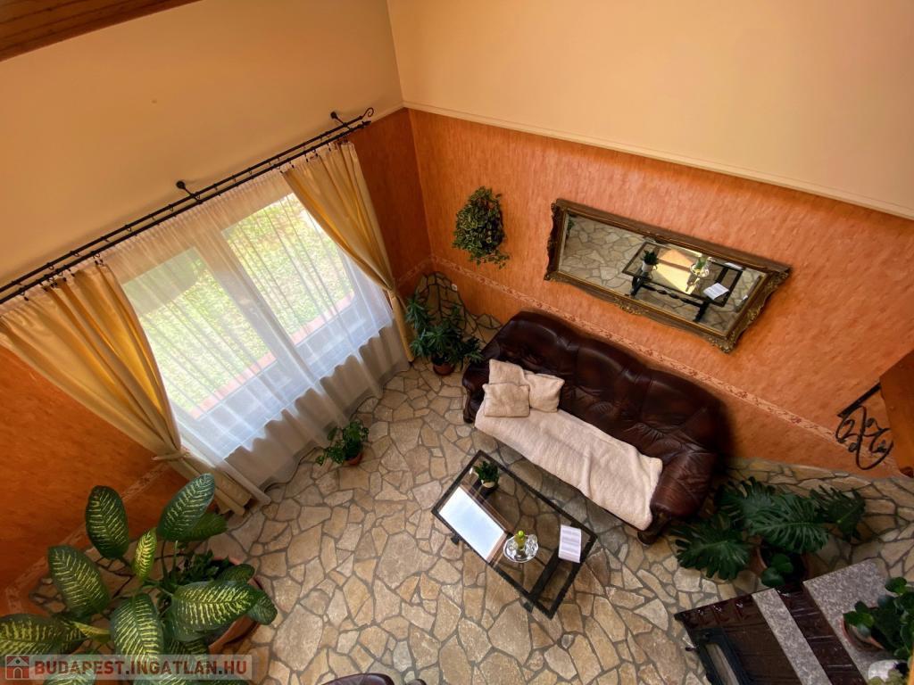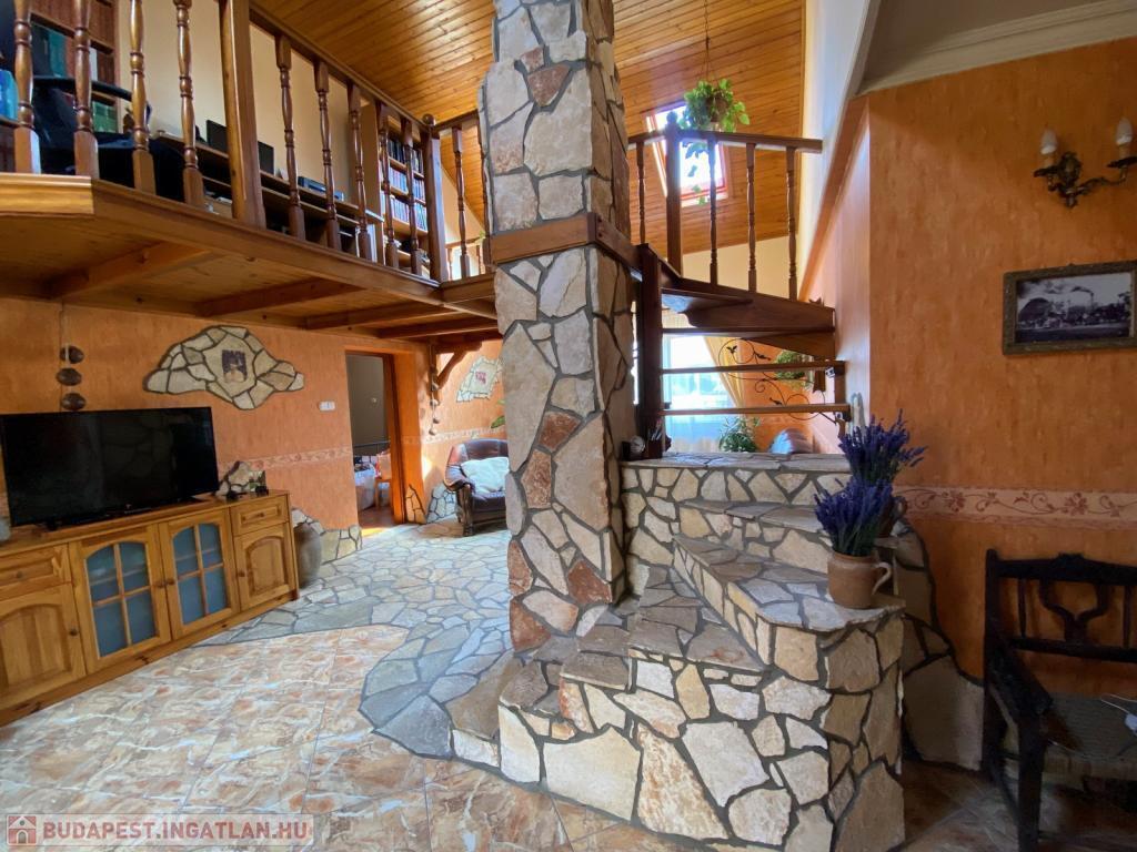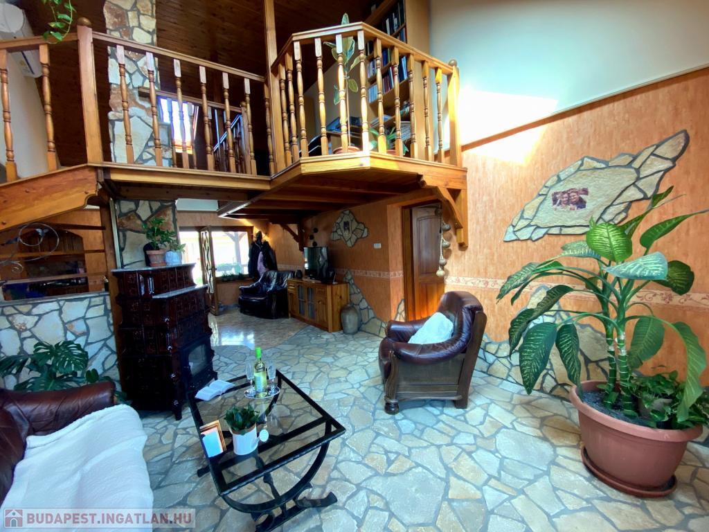 A tágas nappalit (kb.40 nm) spanyol csempe és természetes homokkő burkolja, a mennyezetet fa burkolatok díszítik, melyek melegséget és karaktert adnak a térnek. Ideális helyszín meghitt családi ebédekhez és baráti összejövetelekhez, ahol jókat lehet enni, nevetni, együtt lenni. Itt a belmagasság 4,40 cm, így állógaléria növeli az életteret, ahol kellemes könyvtárszoba, dolgozórész, iroda lett kialakítva, a home-office-ban dolgozók örömére.