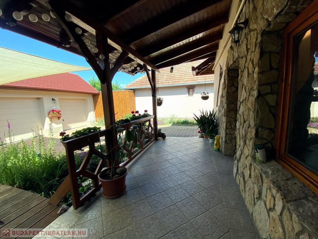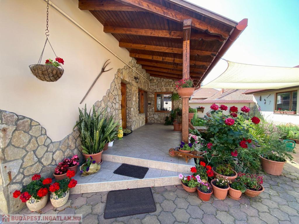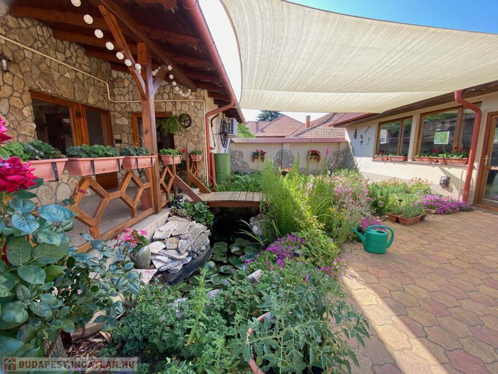A bejárat előtt fedett terasz hív pihenésre, az udvar nagy részét térkő borítja, és egy mesésen kialakított, csodás virágos gondozott kert, kis tó halakkal, tavirózsákkal és hangulatos híd, igazi kis édenkert. Én teljesen beleszerettem, ezt látni kell!