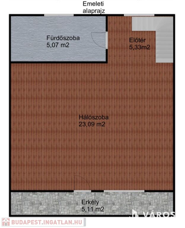 - Az emeleten fürdőszoba, hálószoba, erkély