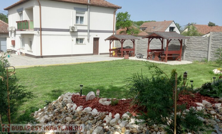Az udvar ház közeli része térkövezve. Udvaron fedett kiülők és háttérvilágitás nyújt kellemes hangulatot. A füvesített hátsó udvar, virágágyás és csobogó tovább emeli a szinvonalát.