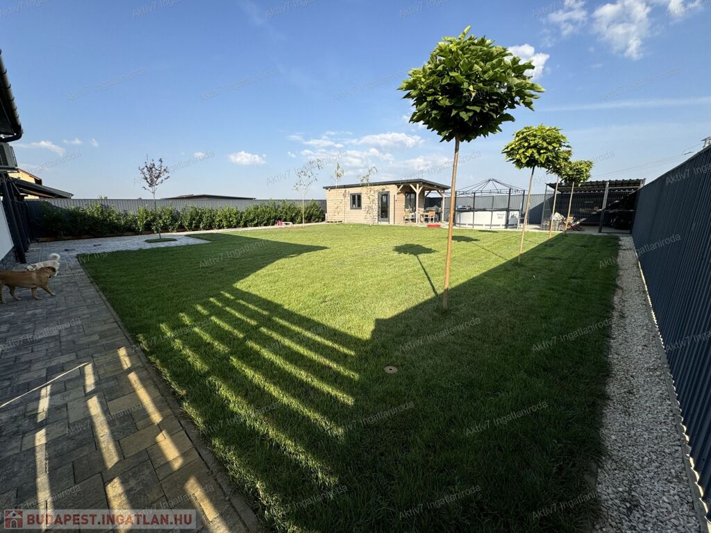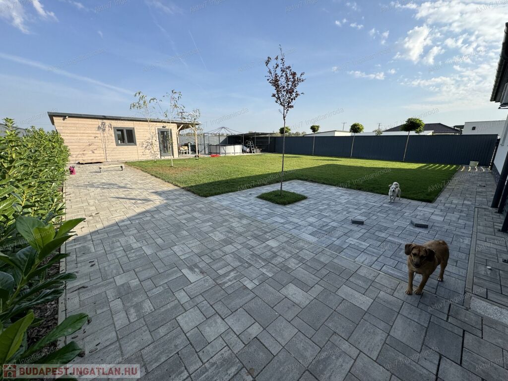 A 840 m2 alapterületű telek rendezett, kerítéssel körülvett, az előkertben 2 elektromos tolókapu található, amelyek a garázshoz és a fedett gépkocsibeállóhoz biztosítanak bejárást. A kert részben térkövezett, részben füvesített, öntözőrendszerrel, melyet fúrt kút és szivattyú működtet. A telken található egy 16 m²-es tároló és egy 28 m²-es szigetelt faház, melyben külön mosdó