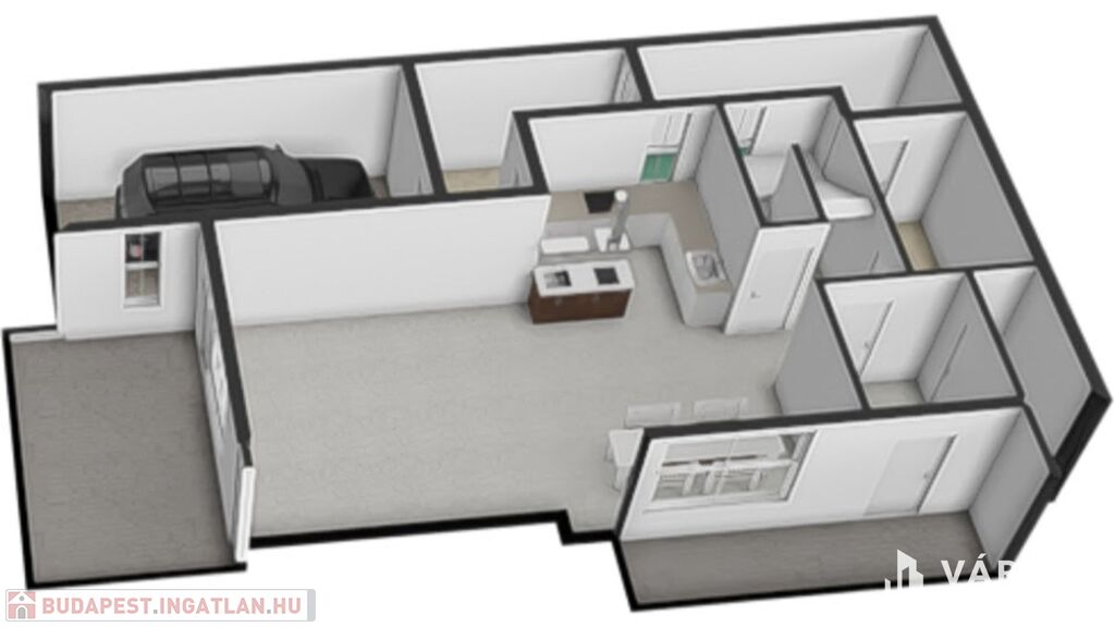 - Nappali, konyha,3.szoba, 1 fürdő, 2 WC, gardrób, háztartási helyiség, tároló,garázs,terasz.patio.