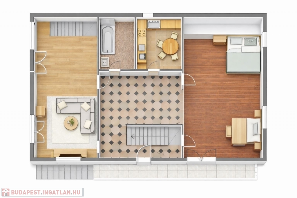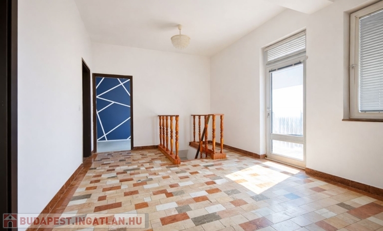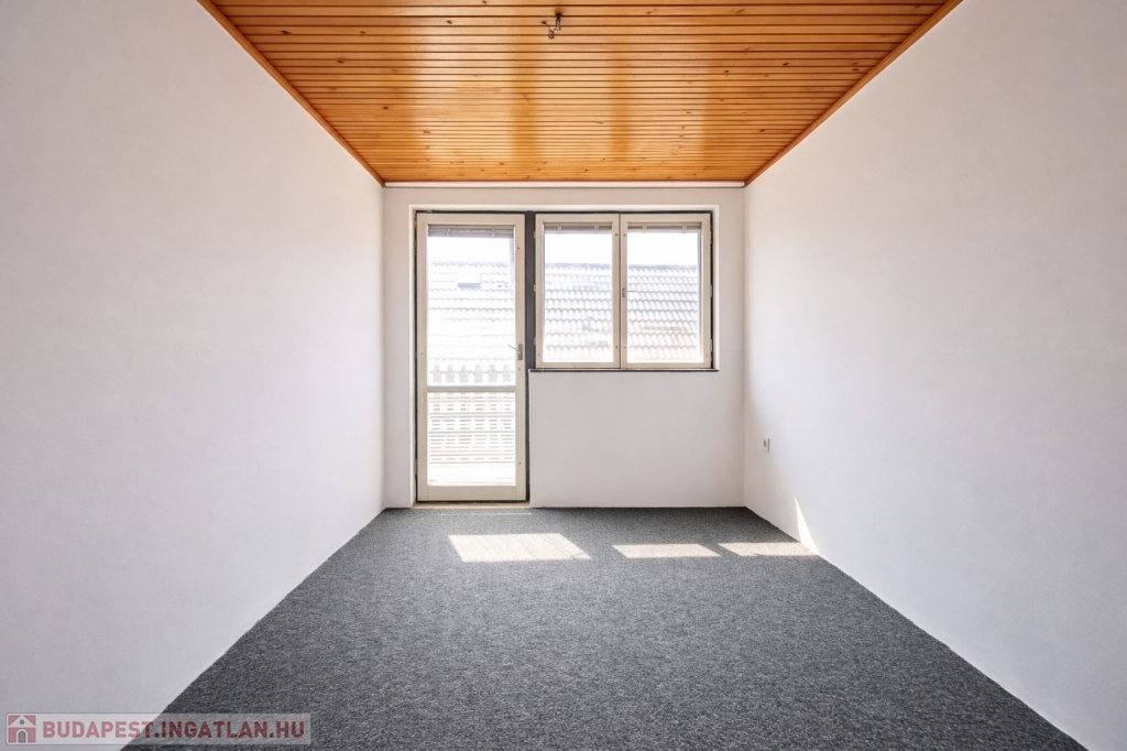 - 100 m², külön bejáratos emelet + tetőtér: nappali–konyha–étkező + 3 hálószoba, 2 fürdőszoba