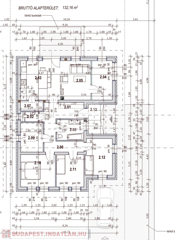 ● Nappali + 4 hálószoba + kamra + háztartási helyiség+ fürdőszoba+ vendég wc+ terasz(16m2)