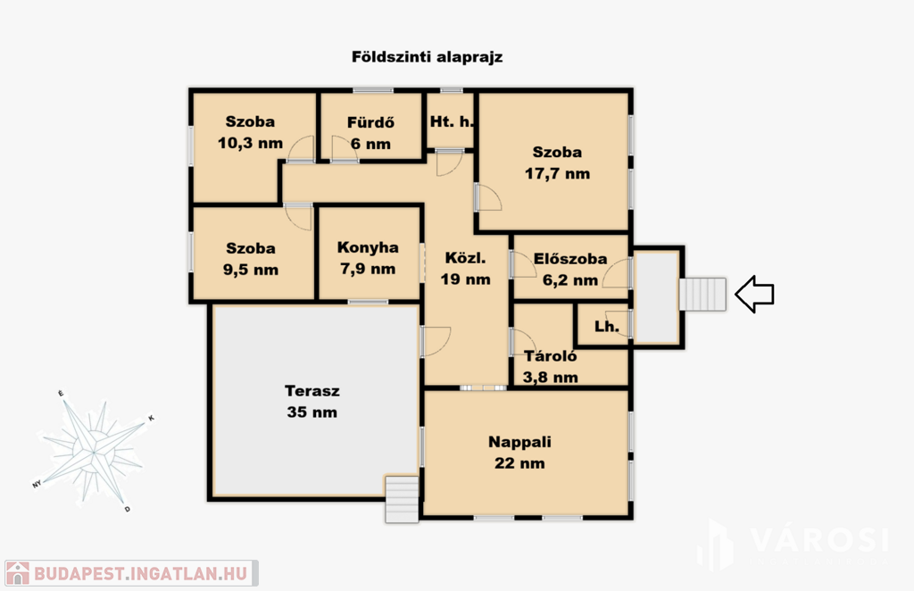 A tágas tetőtérben, további nappali, 3 napfényes szoba, 1 félszoba, konyha, fürdőszoba, wc helyezkedik el, 103 négyzetméteren.