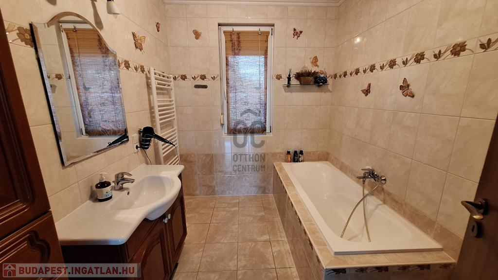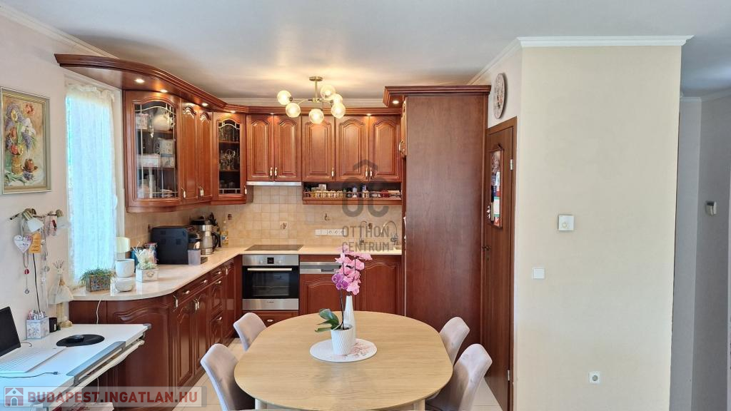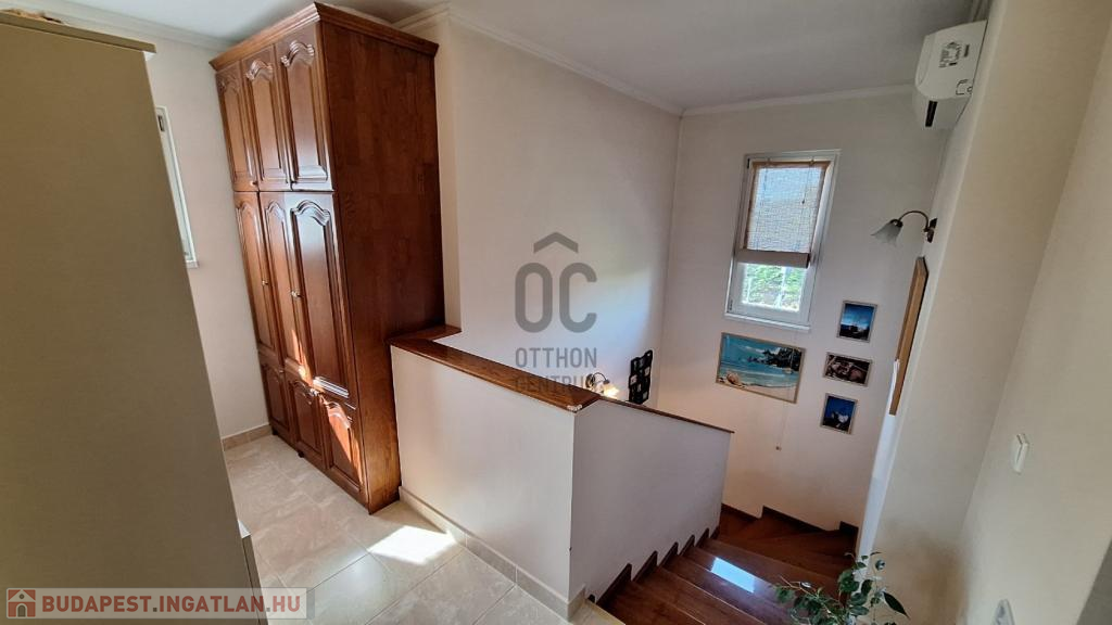 Konyha tömör cseresznyefa frontokkal, beépített cseresznyefából készült előszoba bútor, emeleti közlekedőben is nagy méretű tölgyfából készült beépített bútor, hogy a helyek maximálisan ki legyenek használva pakolásra