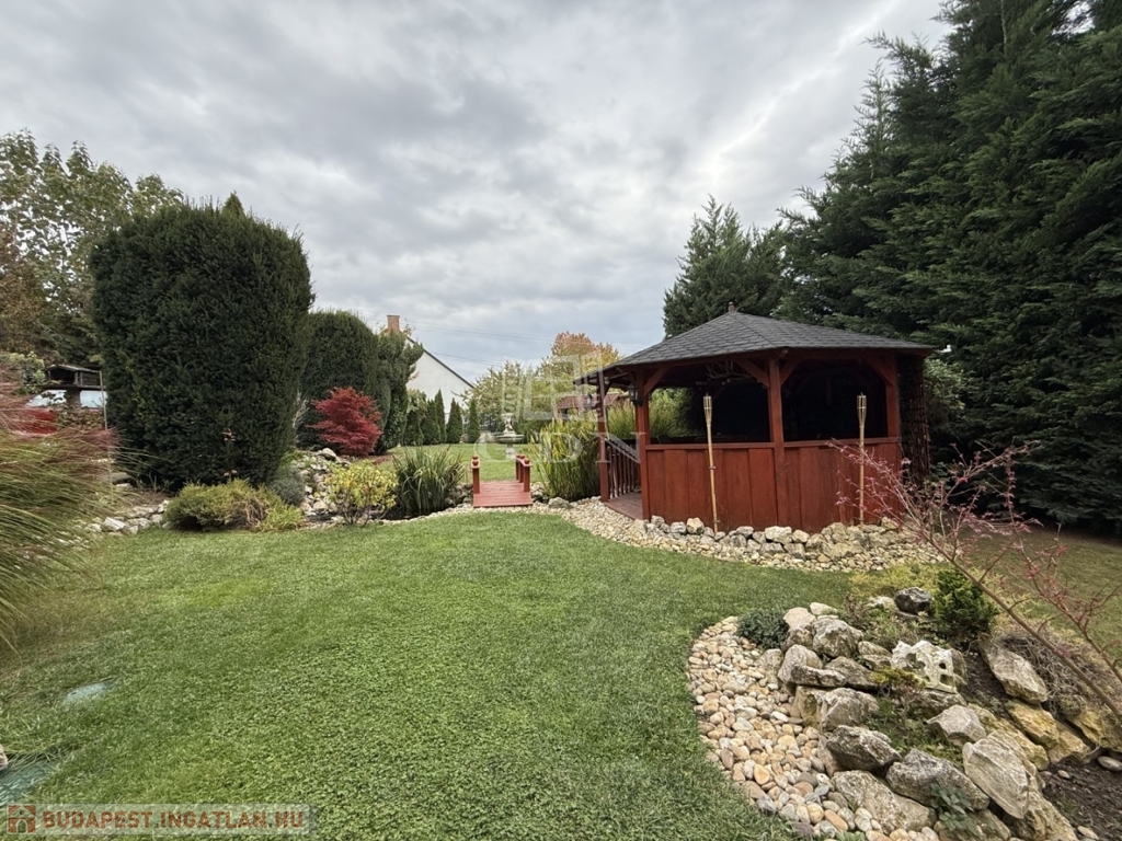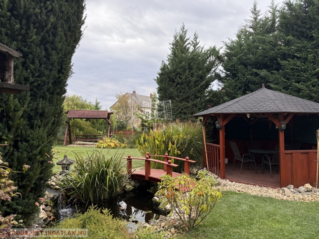 A kert öntözőrendszerrel ellátott, benne dísznövények, kis kerti tó és sütögető teszik hangulatossá a környezetet.