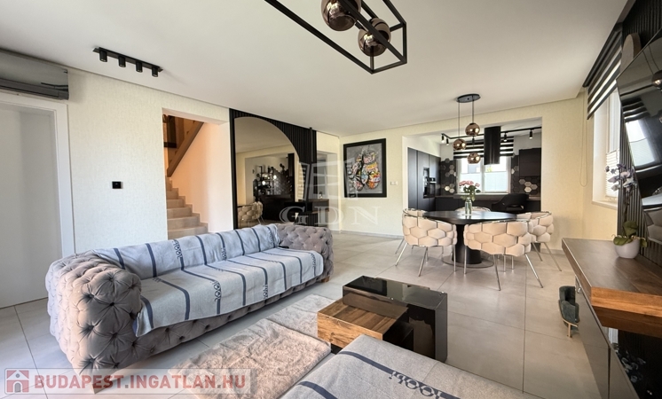 A ház téglaépítésű, szigetelt, tágas, világos, körbe napozott, minőségi anyagokból készült. A burkolatokat tekintve a szobákban magas minőségű laminált padló, a nappaliban a közlekedőben, valamint a konyhában és a vizes helyiségekben jó minőségű járólap található. A nyílászárók 3 rétegű műanyagból készültek, hőszigetelt üvegezéssel, rajtuk redőny és szúnyogháló található. A házban klíma kiépítésre került. A 20m2-es terasz, kényelmes pihenést biztosít. Az utcai kapu elektromosan nyitható. A telek örökzöldekkel, dísznövényekkel parkosított, pihenő terasz, gyermekjátszótér, és egy 27m2-es szauna/konditerem kiépített zuhanyzóval, gépészettel, valamint egy jakuzzi található benne.