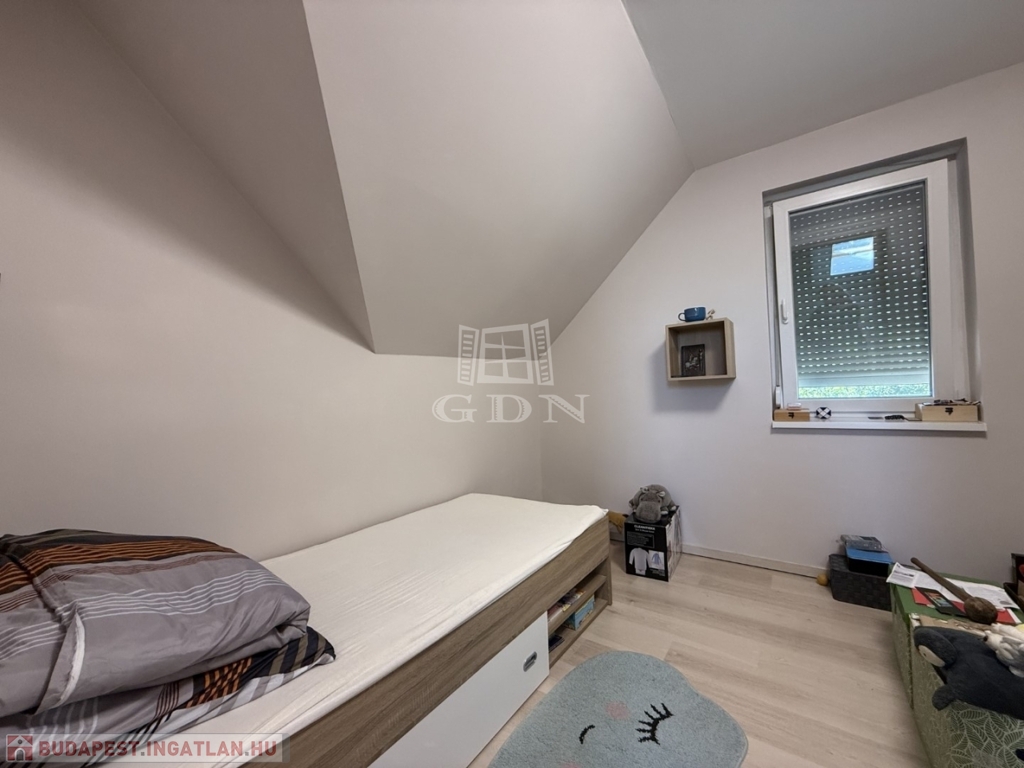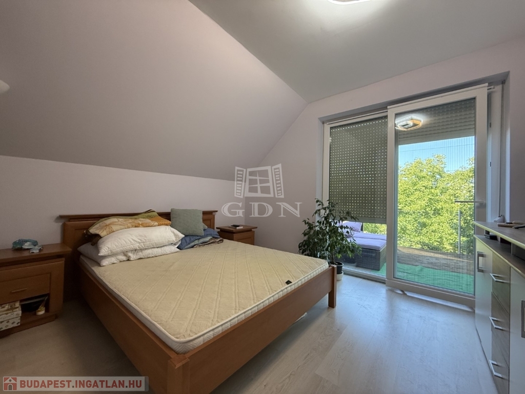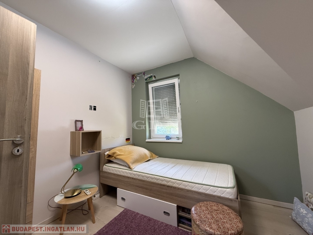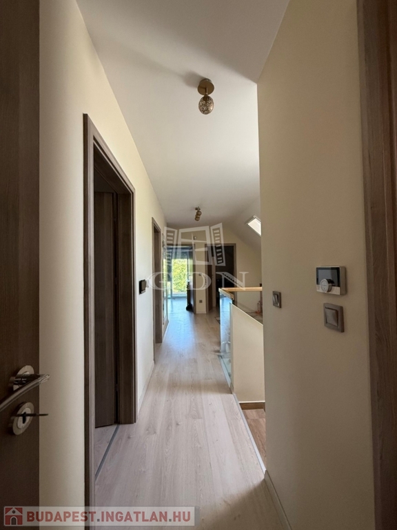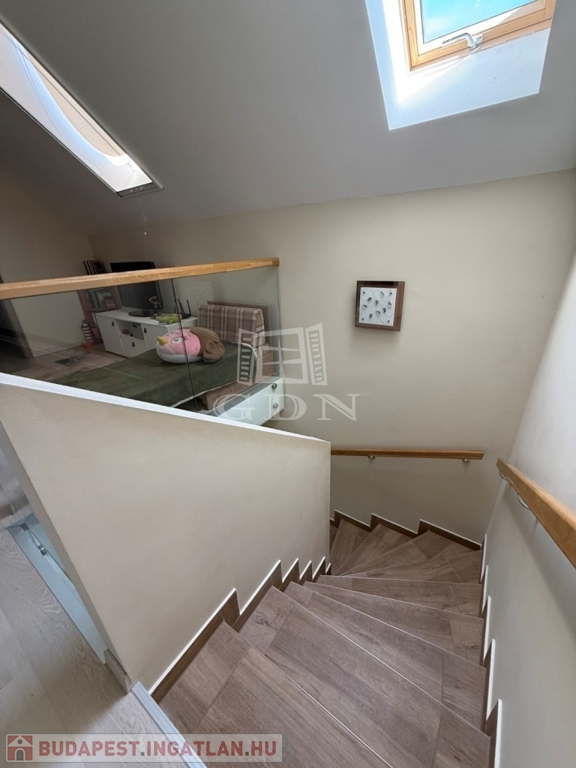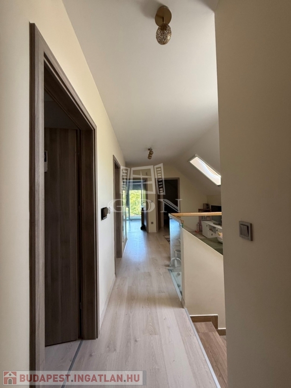 ‣ Tetőtér: kis nappali, három hálószoba (a szülői hálóhoz 9 m²-es terasz kapcsolódik), gardrób, egy kisebb dolgozószoba, fürdőszoba és WC.