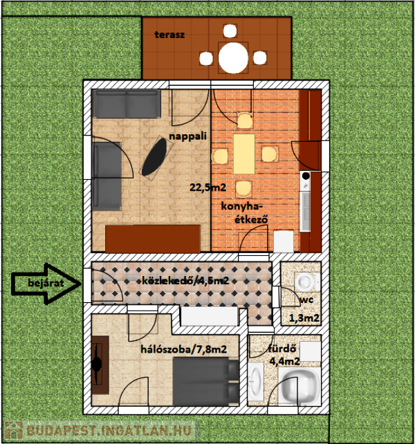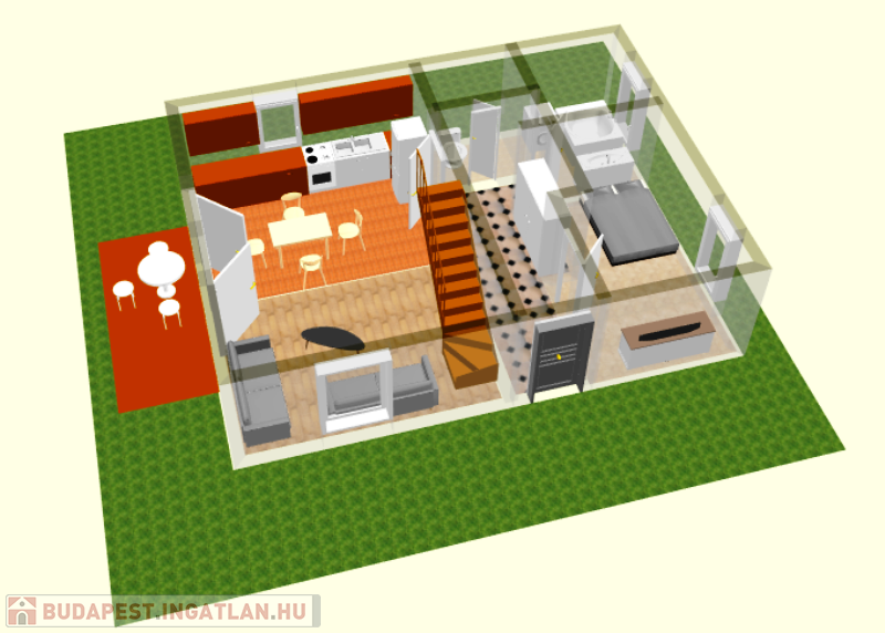 - konyha-étkező- nappali, hálószoba, fürdőszoba , wc a földszinten