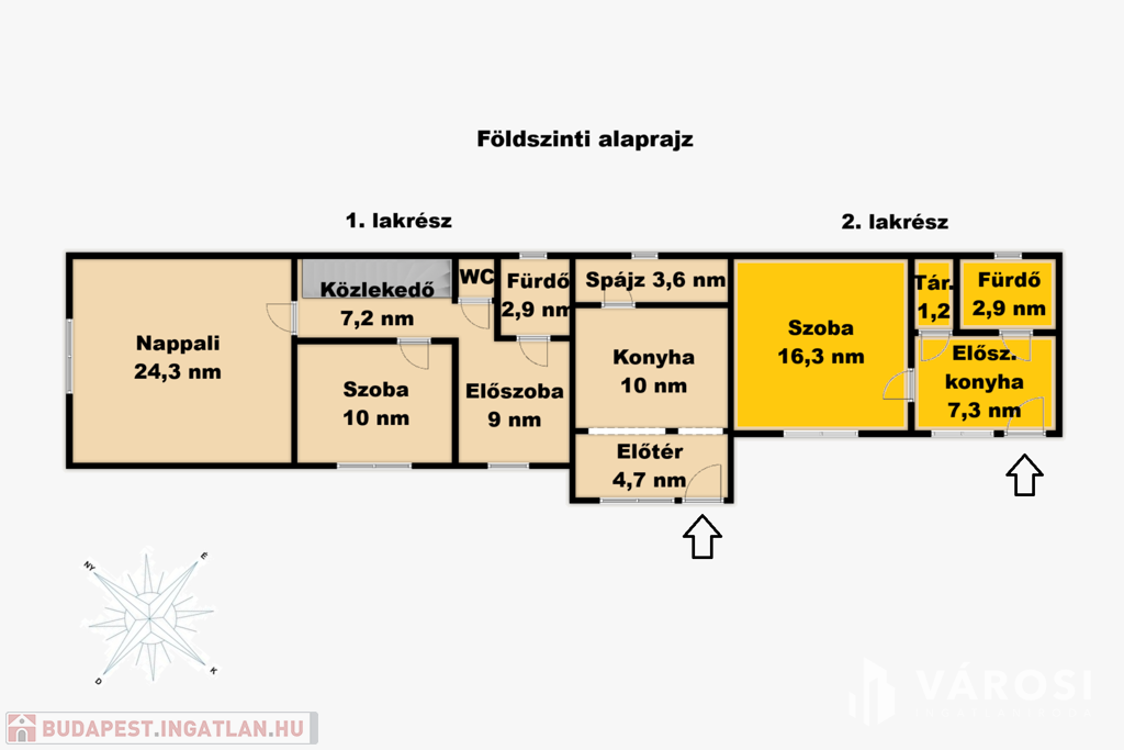 Az épület egy 405 négyzetméteres telken fekszik. Az első lakásban konyha, 2 nappali, 2 szoba, előszoba, 2 fürdőszoba található 103 négyzetméteren, két szinten.