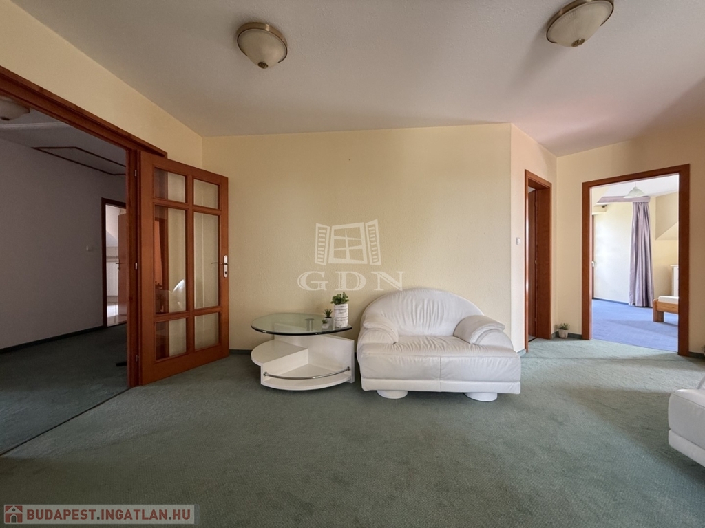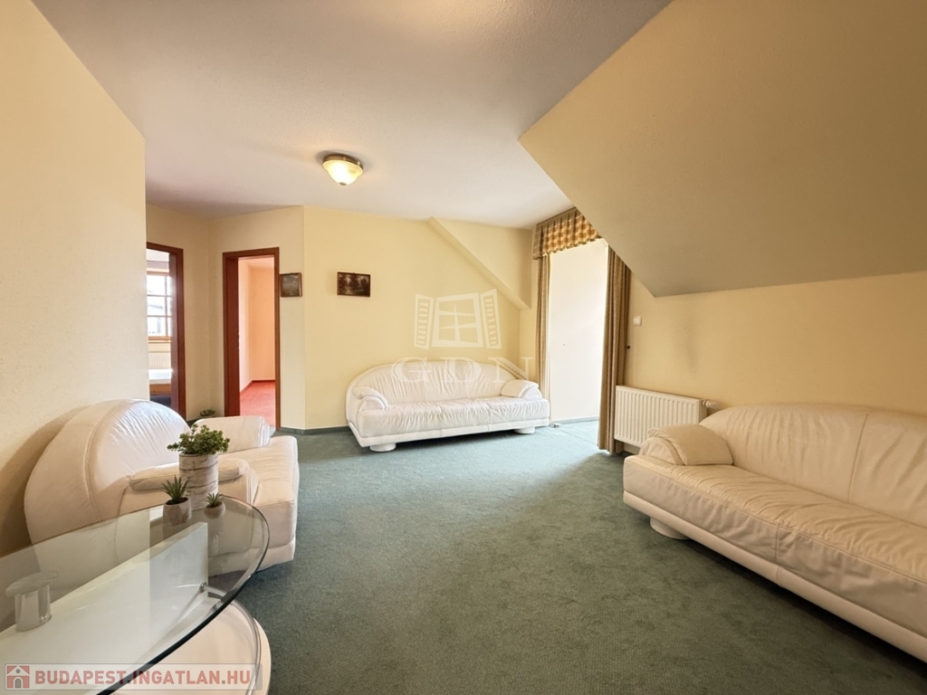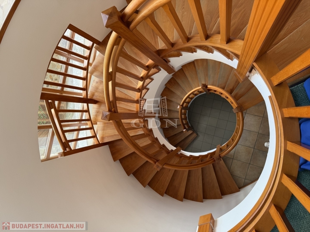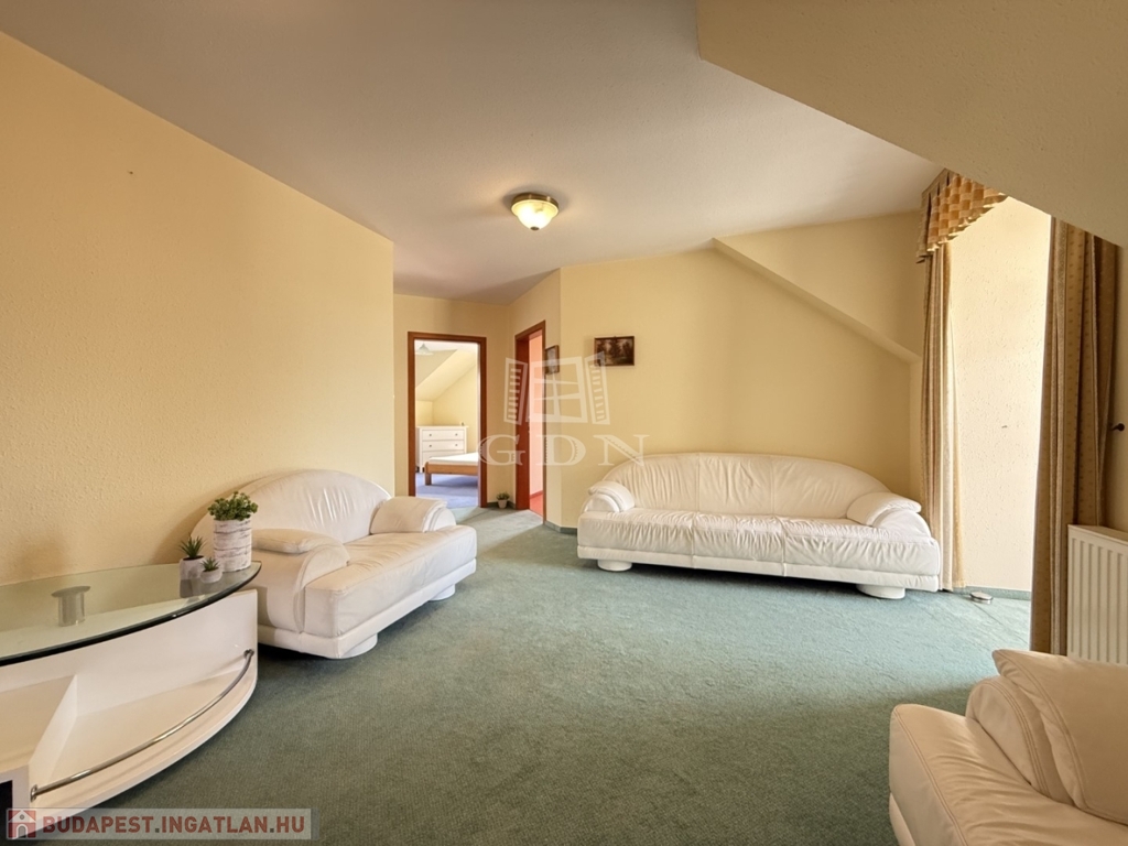 Tetőtér (138m2): A lépcsőházon keresztül közelíthető meg. Az épület utcai szárnyában helyezkednek el a hálószobák, három szoba a nappali, és a fürdőszoba. A nappali felett galéria készült dolgozósarokkal, amelyet híd köt össze a torony tetőtéri szintjével, ahol olvasóhelyiség lett kialakítva. A földszinti déli terasz felett erkély készült, amire a toronyból lehet kijutni.