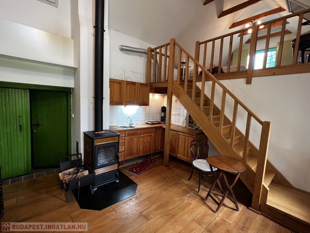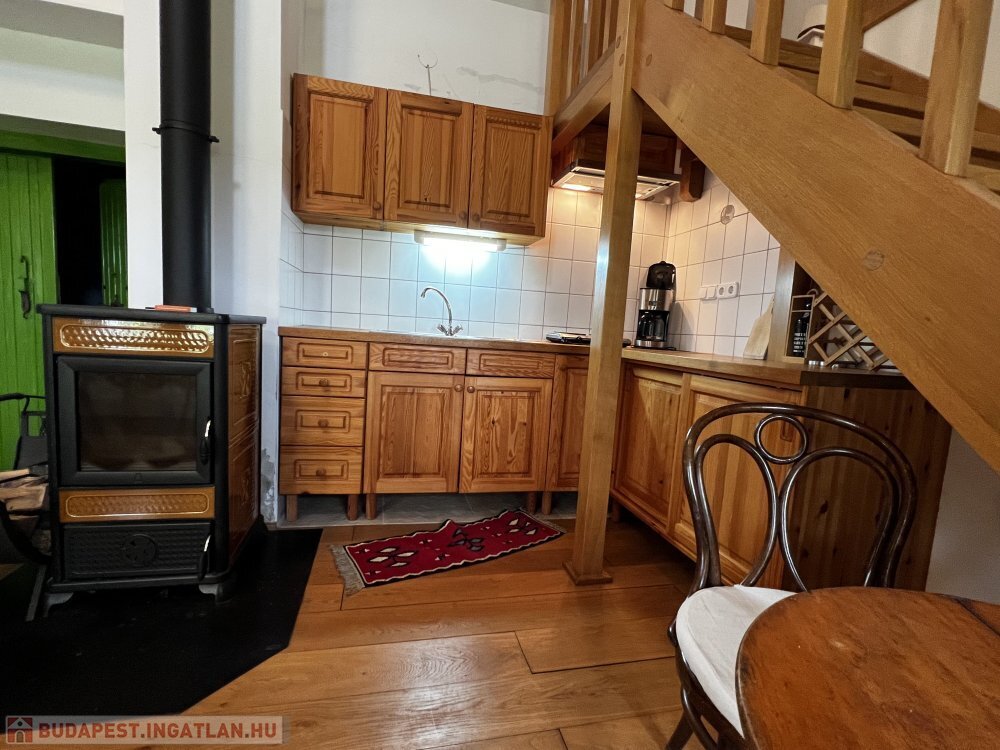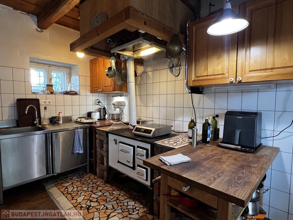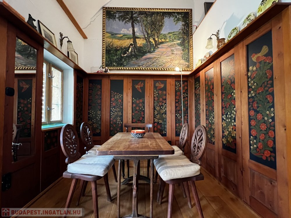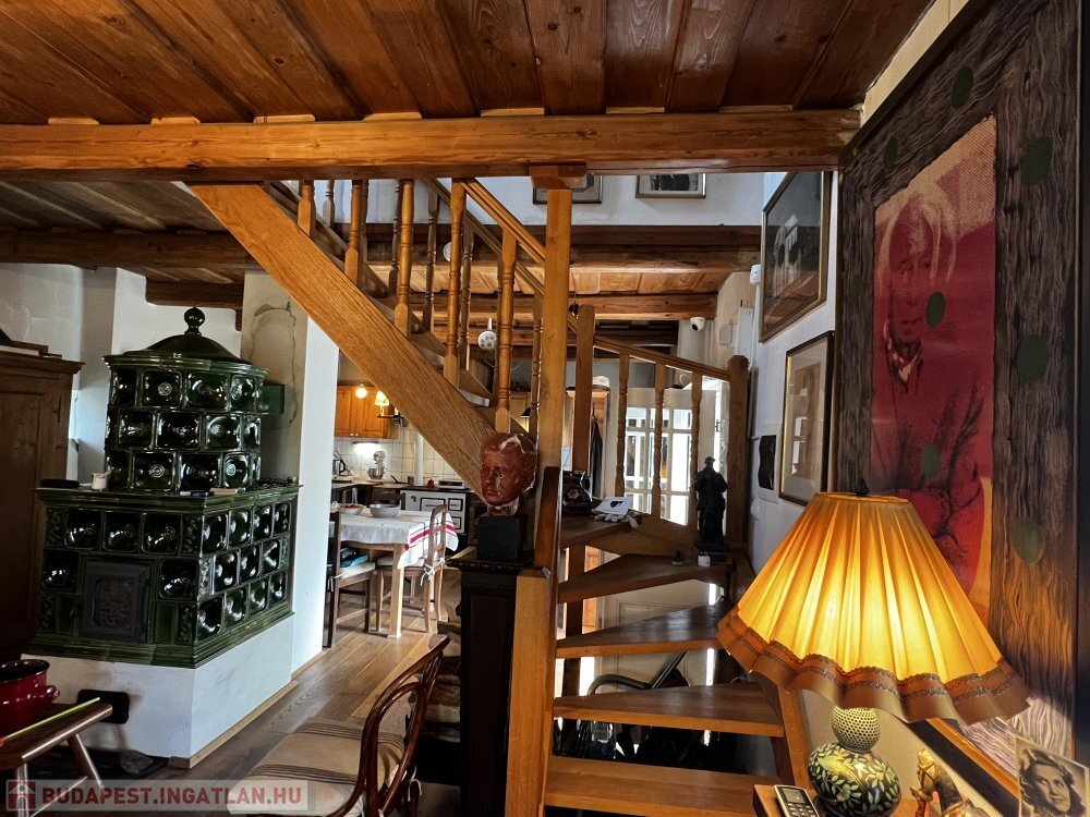 Földszint: tágas nappali-étkező-konyha cserépkályhával és sparhelttel, eredeti, 160 éves látszó gerendákkal és tölgyfa padlóval.