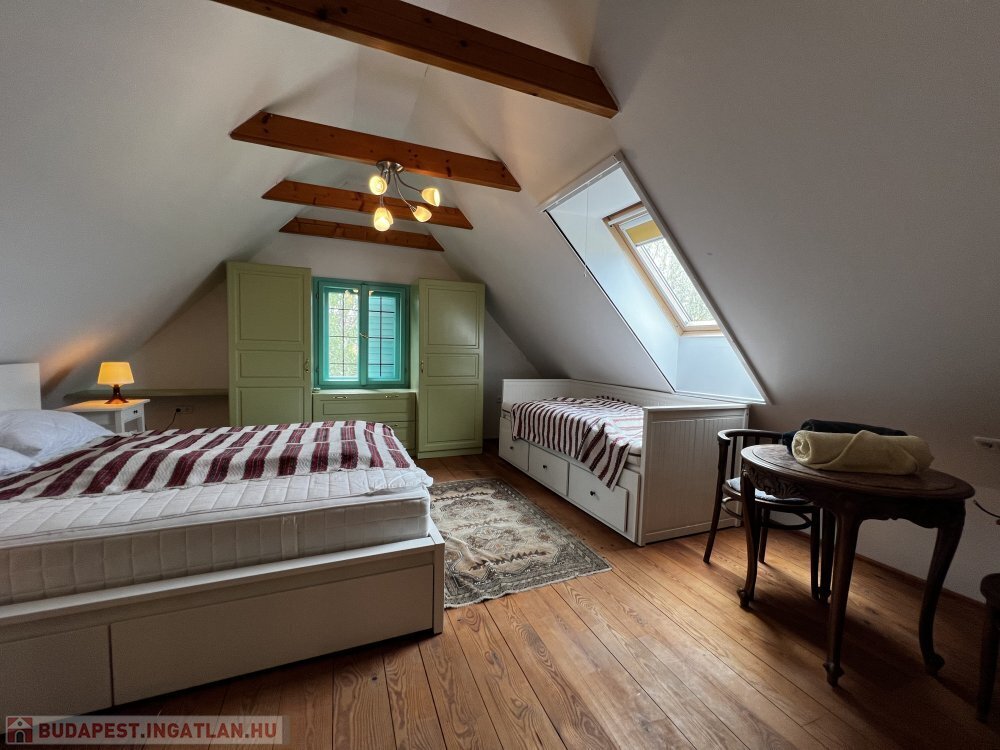 Emelet: két klimatizált hálószoba beépített szekrényekkel, modern fürdőszobával.