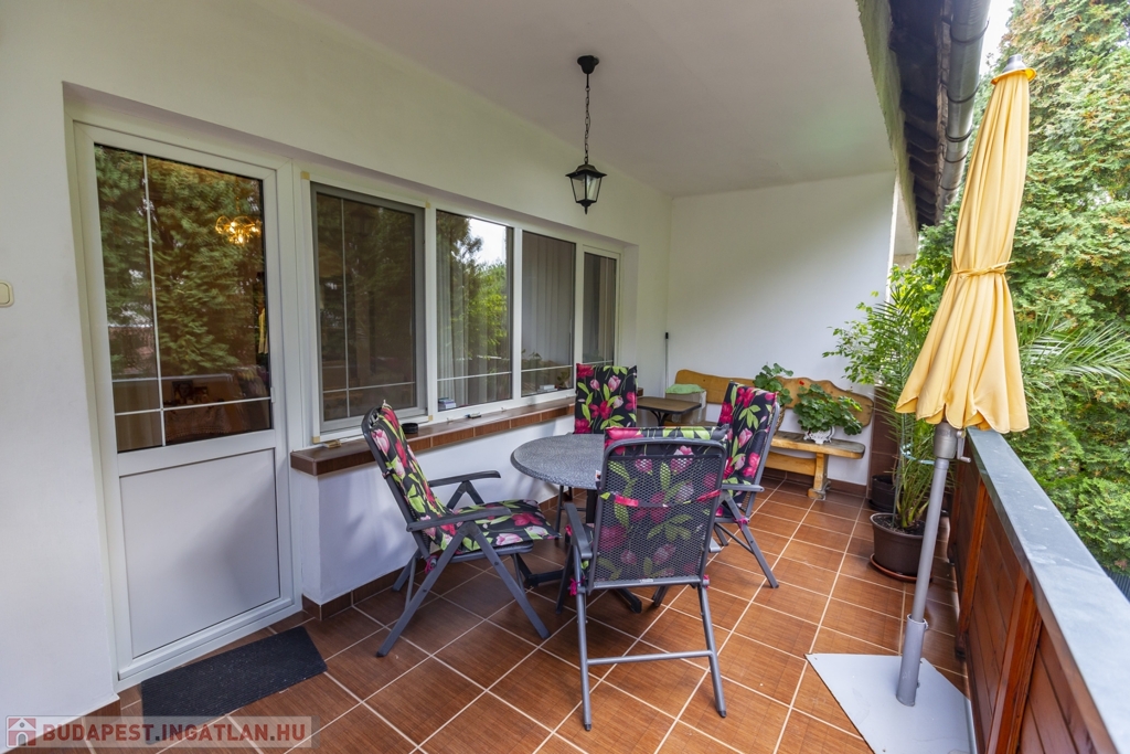 A nappaliból kellemes, nagyméretű fedett teraszra léphetünk, ahol a kerti fák közelségét élvezhetjük.