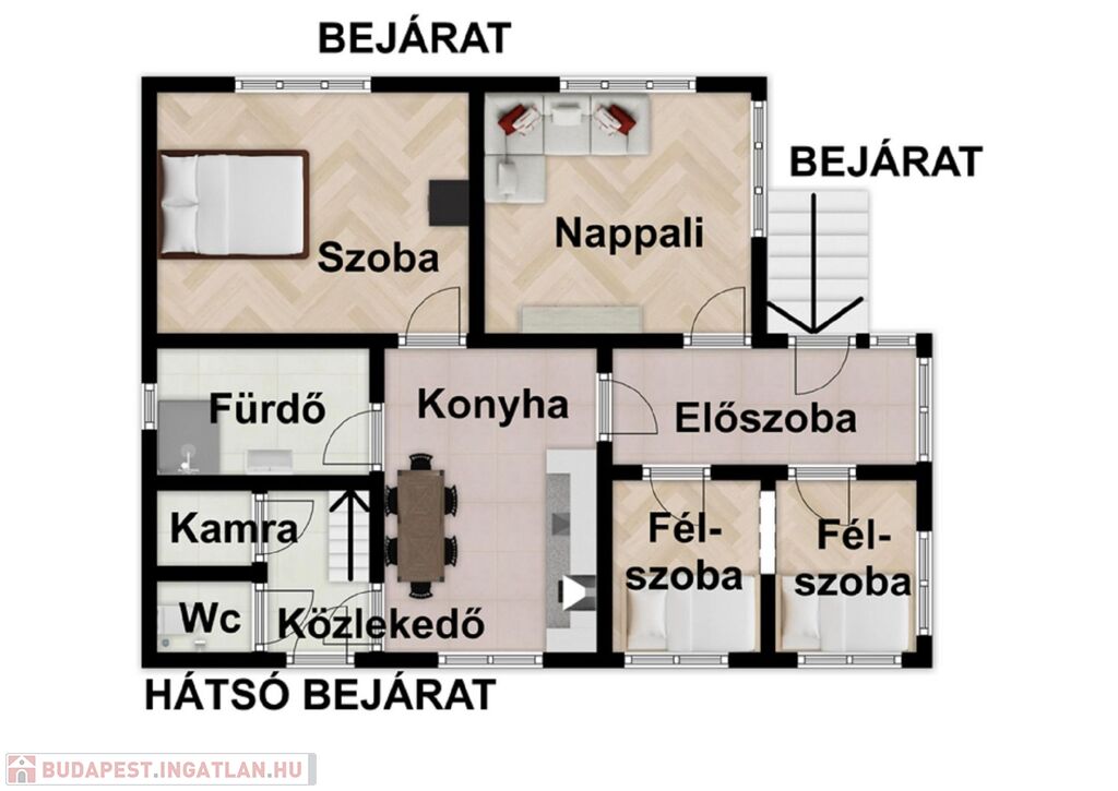 a, 114nm-es családi ház(különálló wc, kamra, konyha, fürdőszoba, 2 félszoba, szoba és egy nappali)