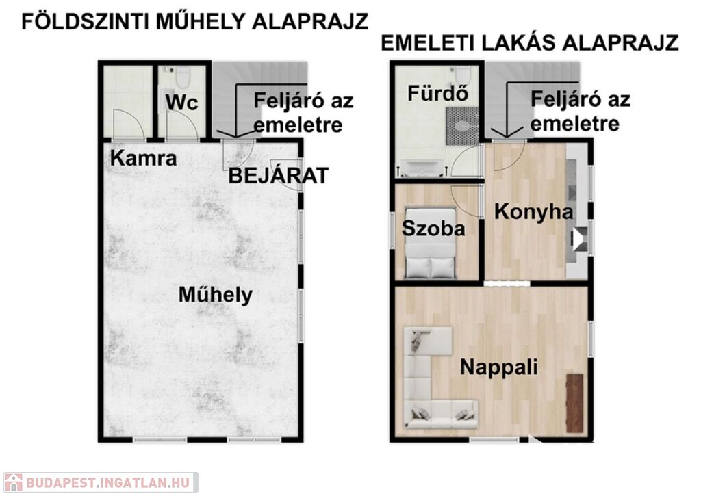 c, a műhely felett helyet foglaló 40nm-es lakás(konyha, fürdőszoba, szoba és egy nappali)