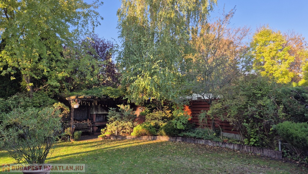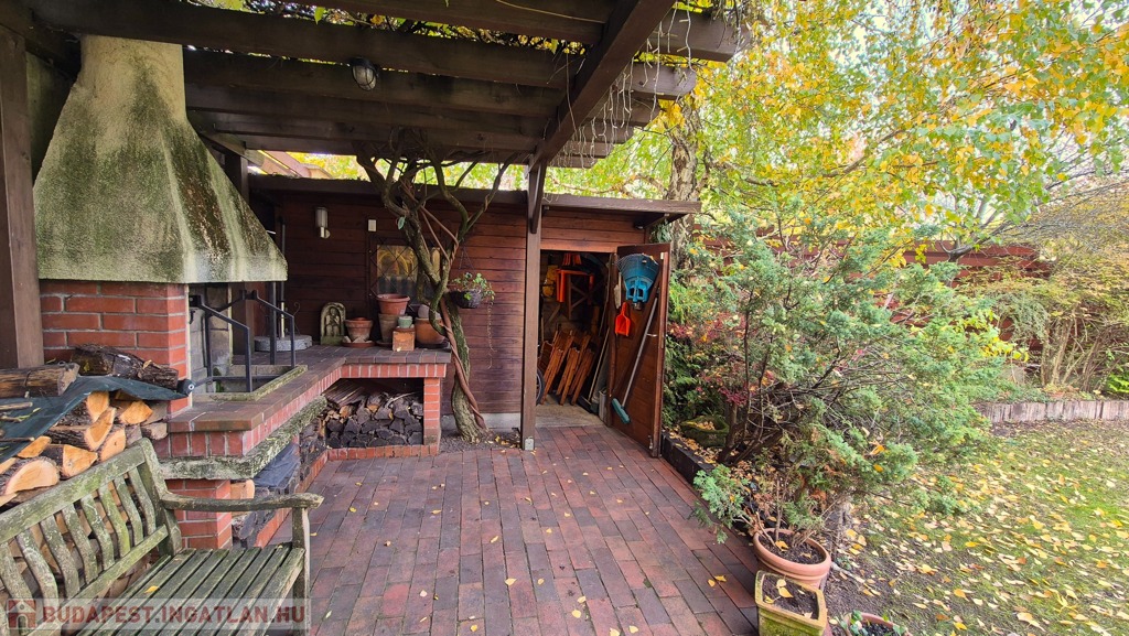 -Hangulatos kertkapcsolat: tervezett, gondozott kert grillezővel, kerti pergolával, 7 m²-es faházzal.
