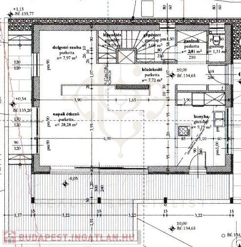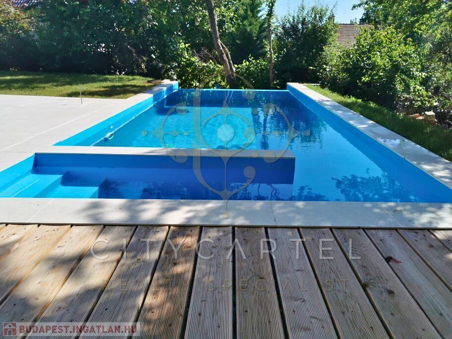 Földszint: Tágas, világos amerikai konyhás nappali és étkező nagy üvegfelületekkel, közvetlen kijárattal a panorámás teraszra és a medencéhez. Dolgozószoba (vagy vendégszoba), külön WC mosdóval, gardrób, gépészeti helyiség.