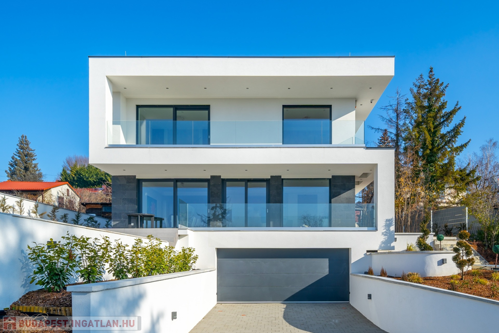 Szentendre Rózsadombján vált elérhetővé egy minimál stílusú luxus villa, melynek bruttó 288 m2 alapterülete van, 837 m2-es panorámás parkosított, medencés telken fekszik egy zsákutcában. Az ingatlan 4 hálószobából, 3 fürdőszobából, konyhából, nappaliból, étkezőből, 3 állásos garázsból, gépészeti helyiségből, tárolóból áll.