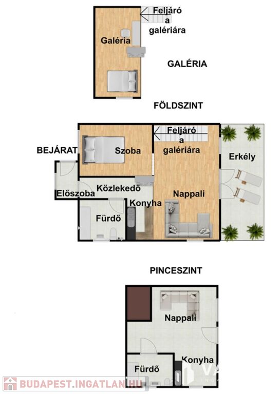 Földszinti lakás fürdőszobából, amerikai konyhás nappaliból, lakószobából, előszobából és egy 20nm-es galériából áll.