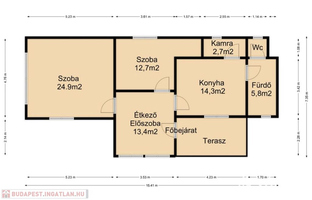 Belső lakrész helységei: 2 külön bejáratú szoba melyek közül, a kis szobához egy kis gardrób is tartozik, előtér-étkező közvetlen teraszkapcsolattal, külön fürdő, külön mellékhelyiség, konyha kamrakapcsolattal.