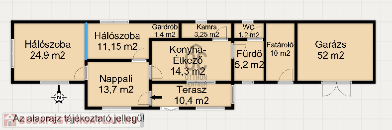 - garázs dupla méretű: 52 m2 nagyságú, melyben a víz és a villany is rendelkezésre áll