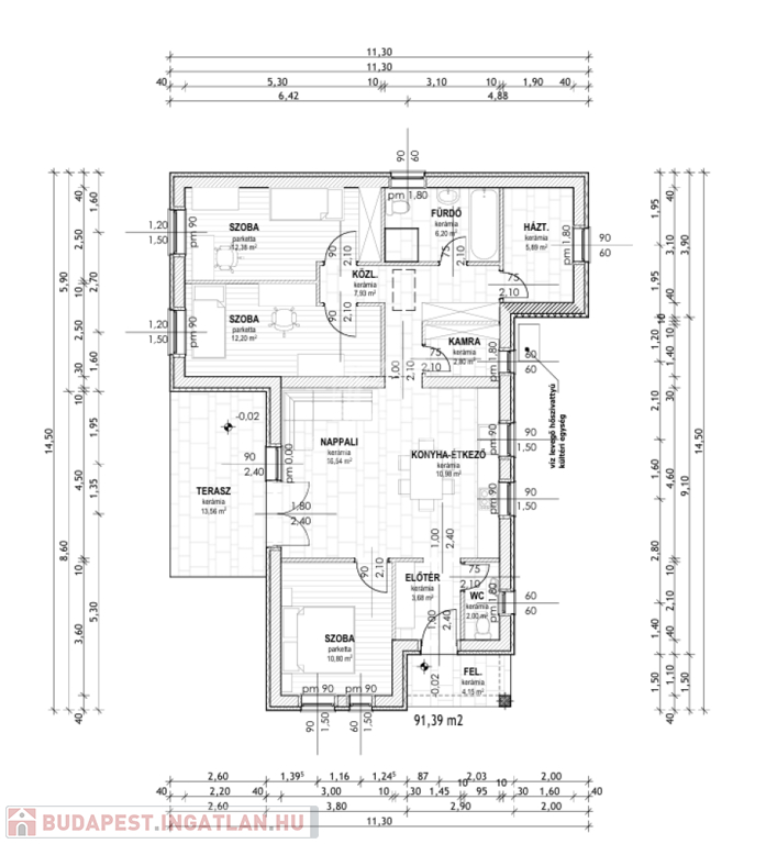 előtér 3,68 m2, wc 2,00 m2, előtér 3,68 m2, terasz 13,56 m2.