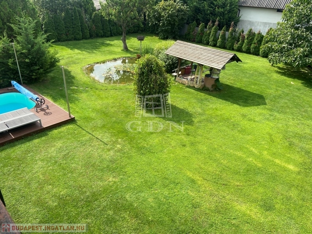 A parkosított, gondozott kert, díszfákkal, cserjékkel, Hummer automata öntözőrendszerrel, kerti sütögetővel, grillezővel, bográcsozóval, zárt kerítéssel, 3db automata kertkapuval, fedett terasszal, 3 db fúrt kúttal, Pedrolló szivattyúval, kerti csapokkal, 24m3 kerti tóval, Firestone kerti csobogóval, 40m3 megfelelő szűrőrendszerrel áll rendelkezésre.